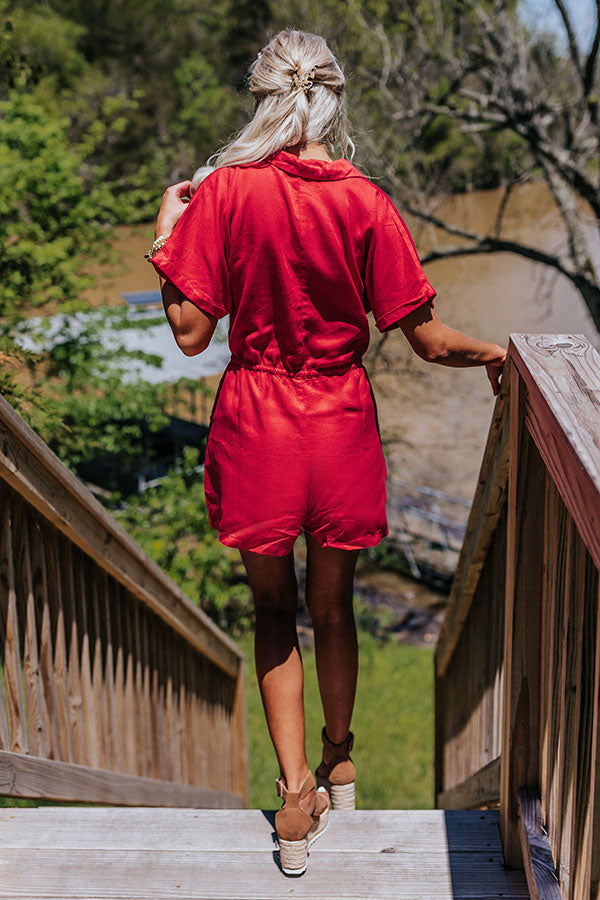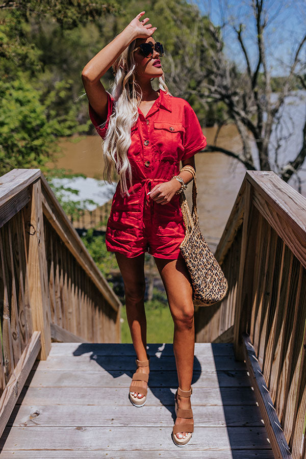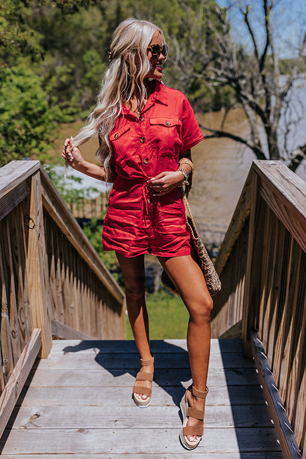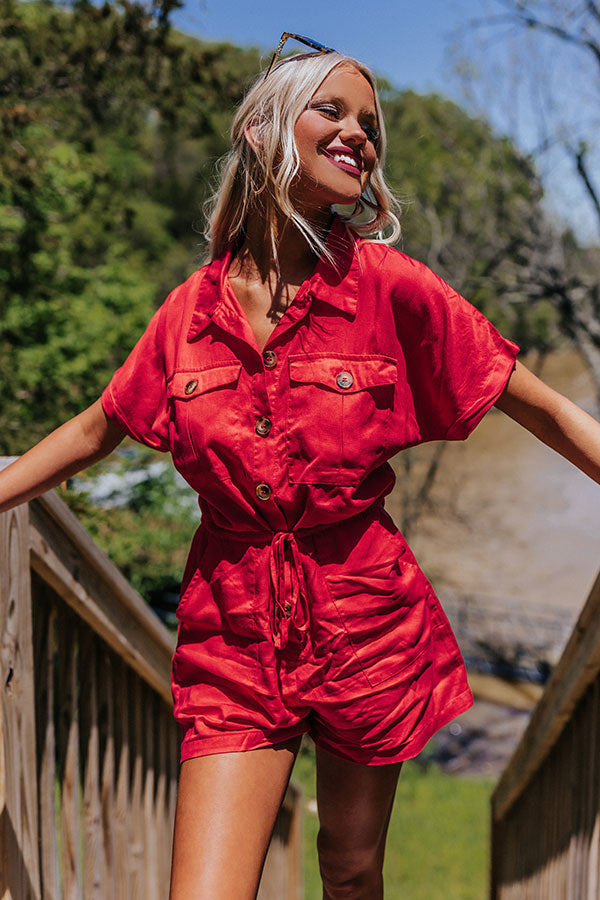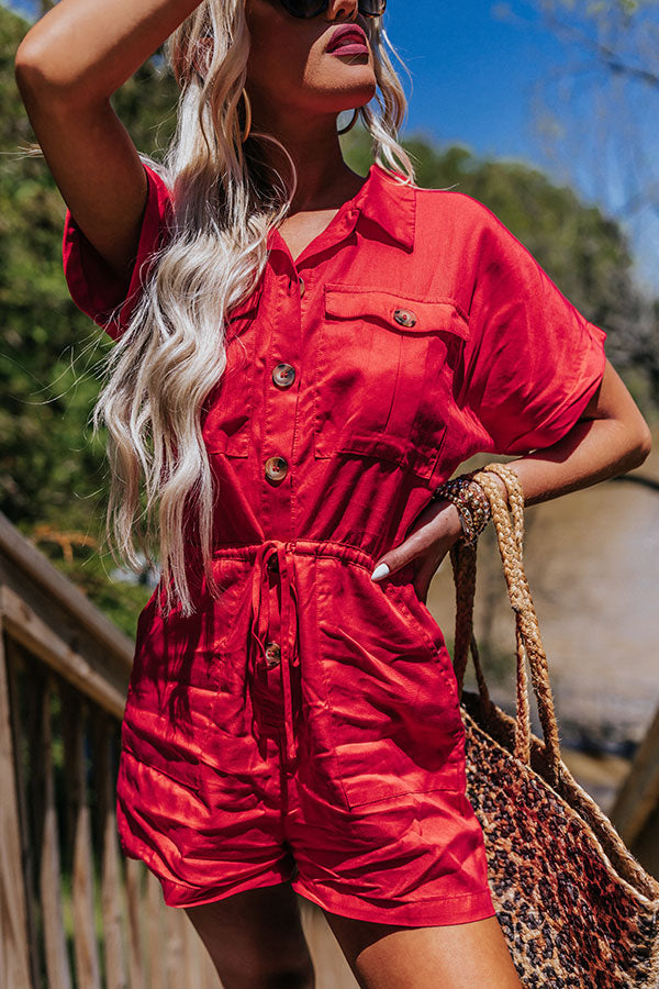 Effortlessly head into the weekend in our classy red 'Star Sign Romper' featuring lightweight material, a button down front with a collared neckline, short sleeves, two side pockets and two chest pockets with flap closures, a cinched waistline with a tie belt, and a relaxed shorts silhouette that ends in straight upper-thigh length hemlines! Measurements
