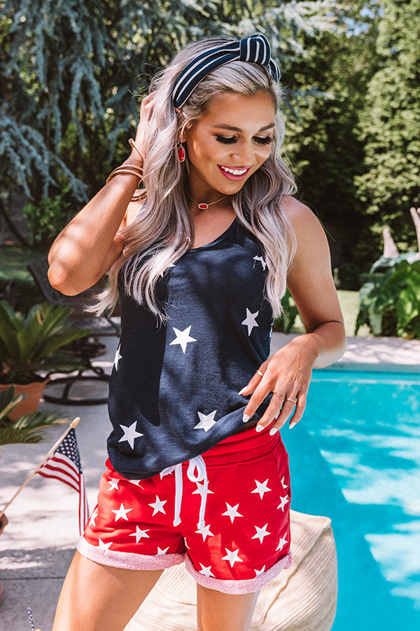 Keep it casual but cute in our red "Starcrossed Shorts" featuring soft lightweight material patterned with white stars, a wide elastic waistline with a tie belt, accent side pockets, and a relaxed silhouette that falls into cuffed straight upper-thigh length hemline! This adorably patriotic piece with styles perfectly with our matching "Starcrossed Tank in Red," trendy sneakers or sandals, and a headband for the ultimate comfy two-piece Fourth of July look! Measurements