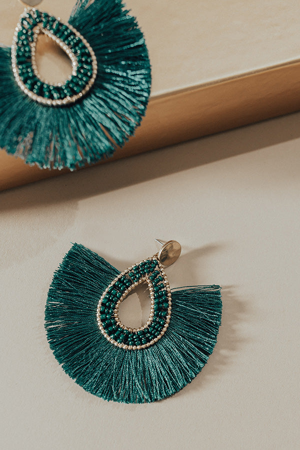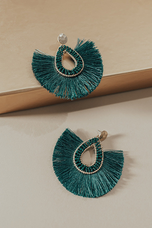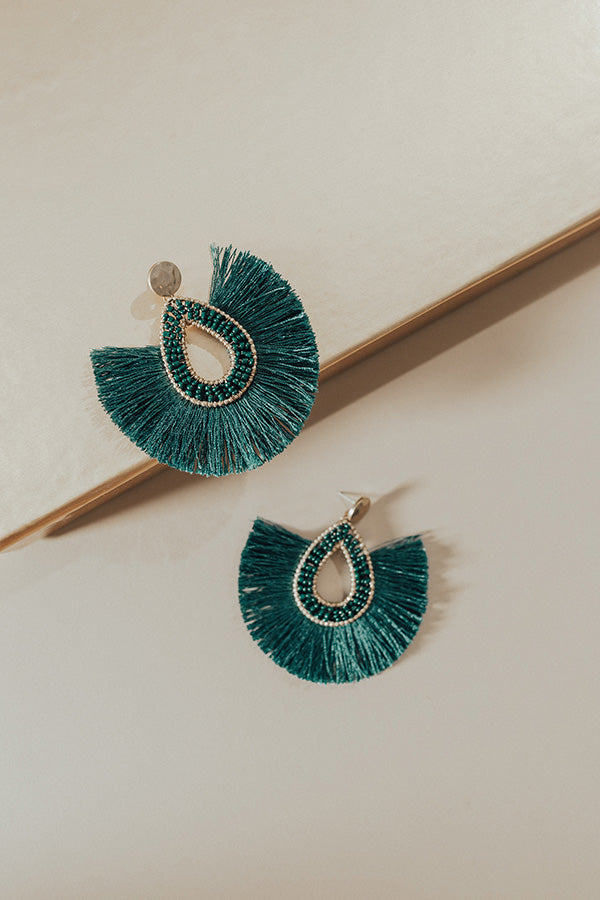 Kick off the fall season in style when you accessorize with the "Stargazing Earrings" featuring circle studs and textured teardrops with hunter green colored tassel fans!