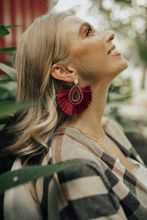 Kick off the fall season in style when you accessorize with the "Stargazing Earrings" featuring circle studs and textured teardrops with wine colored tassel fans!