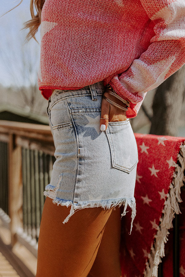Our cute 'Stargazing' shorts is the upgrade your wardrobe has been asking for with their lightweight light wash denim material, white star pattern, hidden zip fly with a button closure, midrise waistline with belt loops, classic four-pocket cut, and flattering silhouette that ends in distressed upper-thigh length hemlines! on products