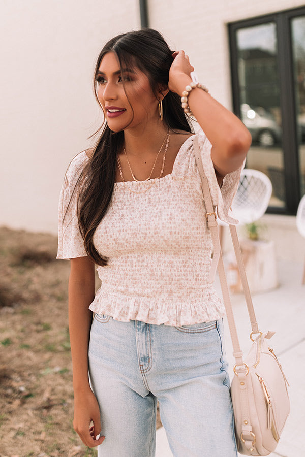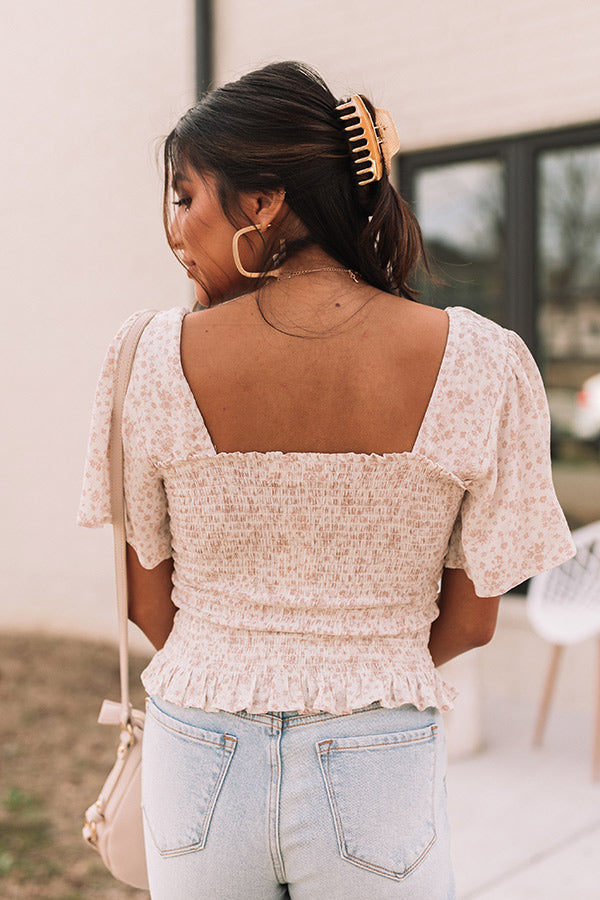Dress like a starlet in this darling white top featuring lightweight material patterned with a small latte colored floral print, a square neckline and upper back, flowy short sleeves, and a flattering smocked silhouette that ends in a ruffled hemline! Measurements