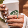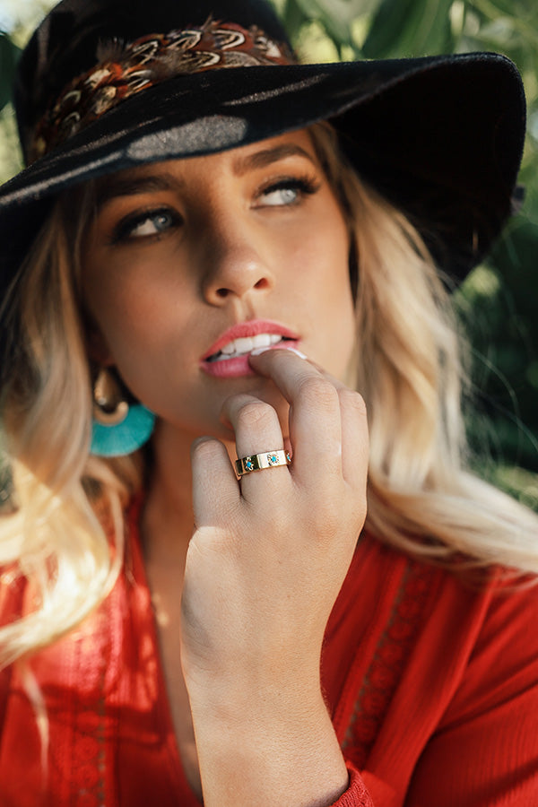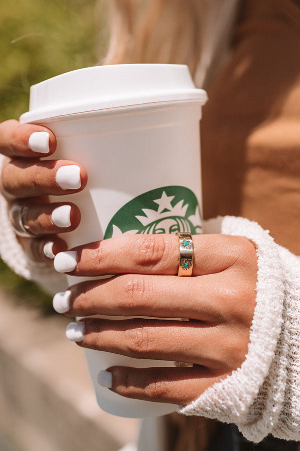 Slarlight, starbright, you will want to wear this ring all night! This piece features turquoise stones set into a thick gold adjustable band!