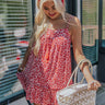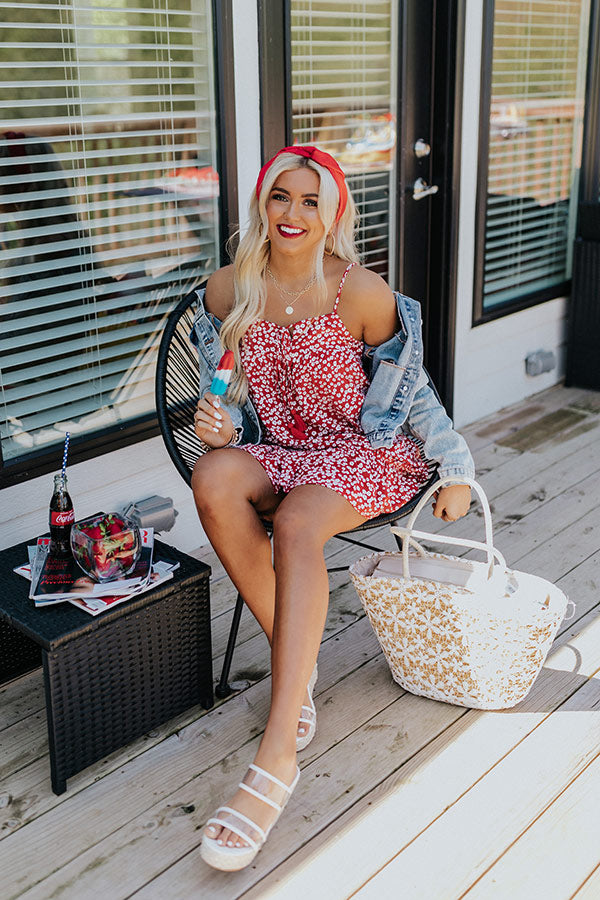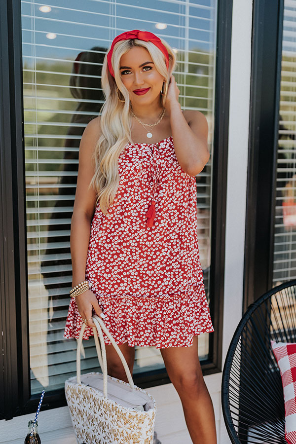 You are sure to have a starlit summer when you wear this charming red shift dress featuring lightweight flowy material patterned with a white floral print, a scooped neckline with a tie closure, adjustable spaghetti straps, and a relaxed silhouette that falls into a peplum bottom with an uneven mid-thigh length hemline! Measurements