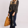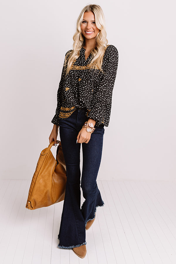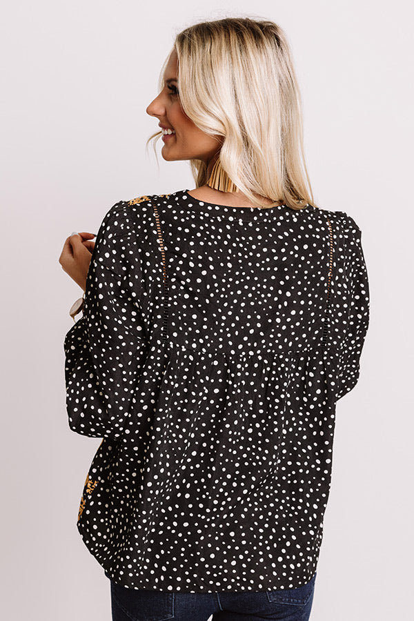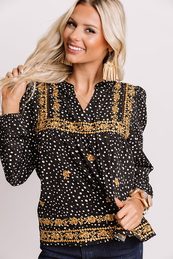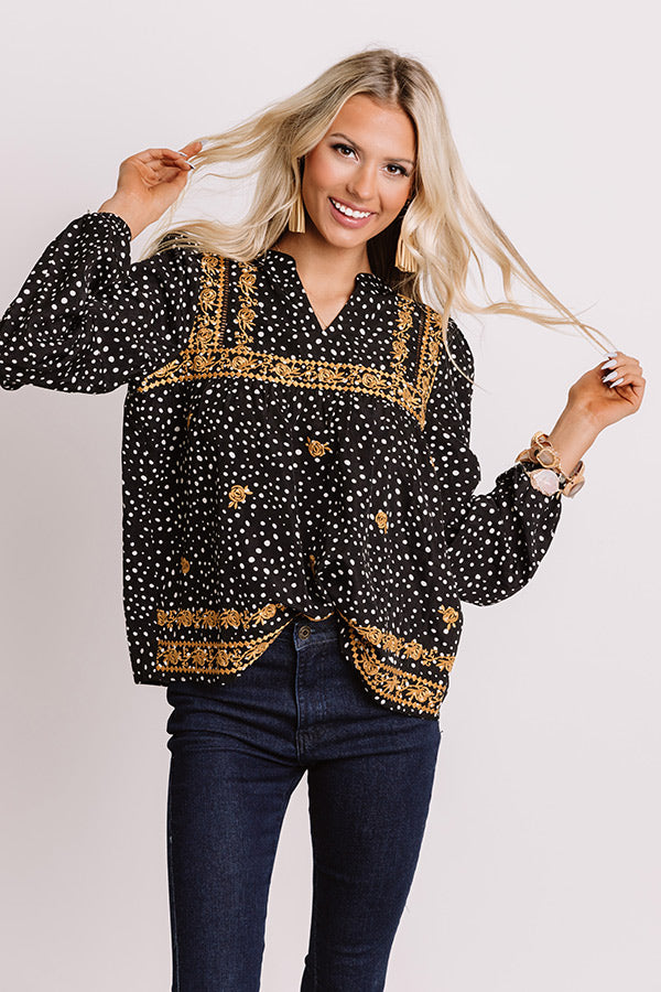 You are sure to be the star of the show when you wear this unique black shift top featuring lightweight material patterned with white polka dots and intricate gold floral embroidery, a v-cut neckline, long bubble sleeves with fitted elastic cuffs, and a relaxed silhouette that falls into a straight hemline!