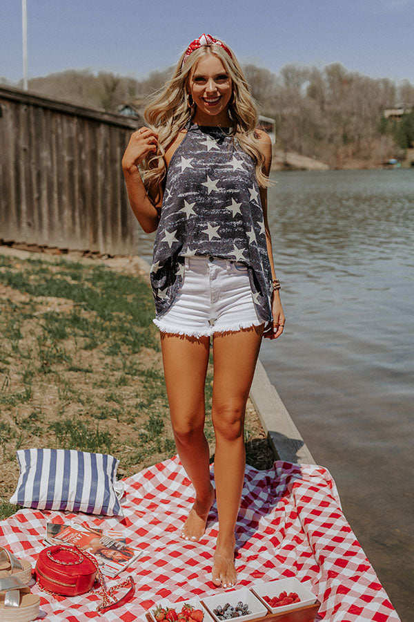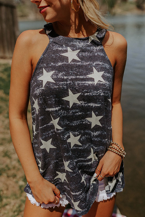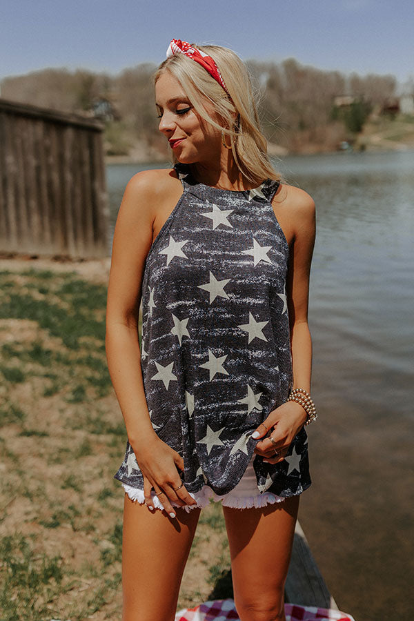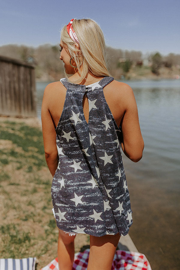 There are sure to be starts in your eyes when you see how lovely this patriotic navy shift tank is with its soft lightweight material, white star pattern, high rounded neckline, sleeveless shoulder straps with a racerback fit, keyhole accented upper back with a button closure, and relaxed silhouette that falls into a straight hemline! on products