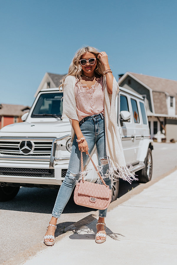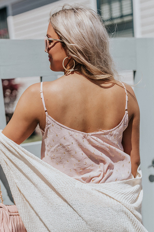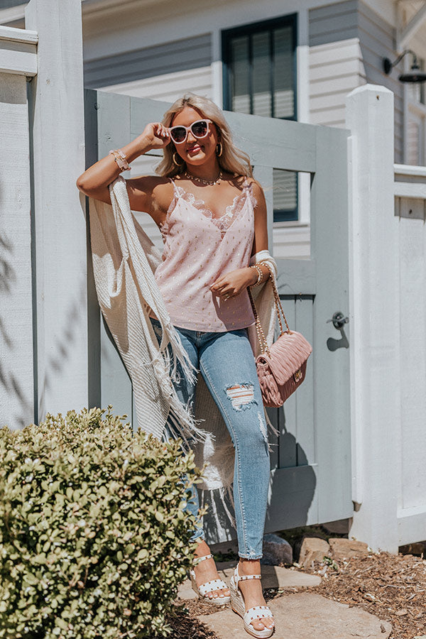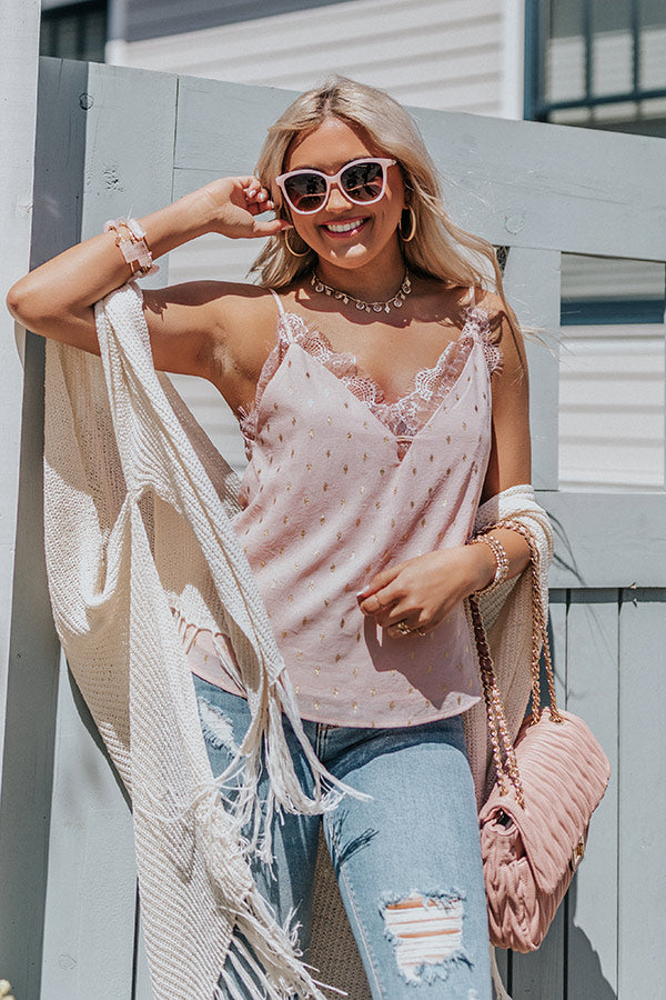 You won't find a more versatile summer piece than our chic blush hued 'Starry Romance Shift Tank' featuring lightweight flowy material patterned with a small gold diamond print, a v-cut neckline with intricate lace trim detailing, adjustable shoulder straps, and a relaxed silhouette that falls into a straight hemline! Measurements