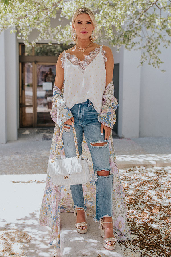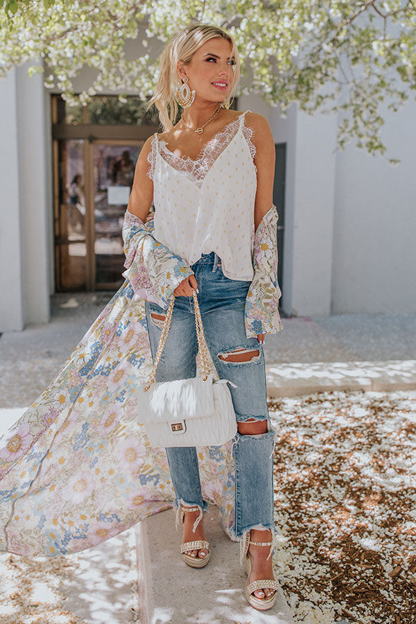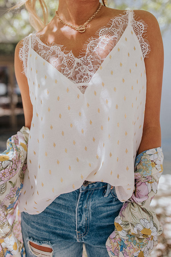 You won't find a more versatile summer piece than our chic ivory hued 'Starry Romance Shift Tank' featuring lightweight flowy material patterned with a small gold diamond print, a v-cut neckline with intricate lace trim detailing, adjustable shoulder straps, and a relaxed silhouette that falls into a straight hemline! Measurements