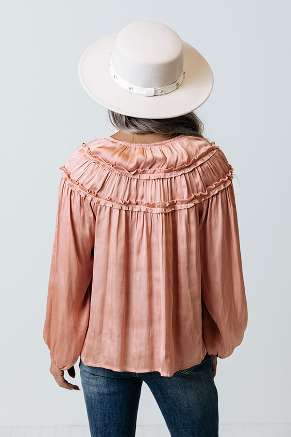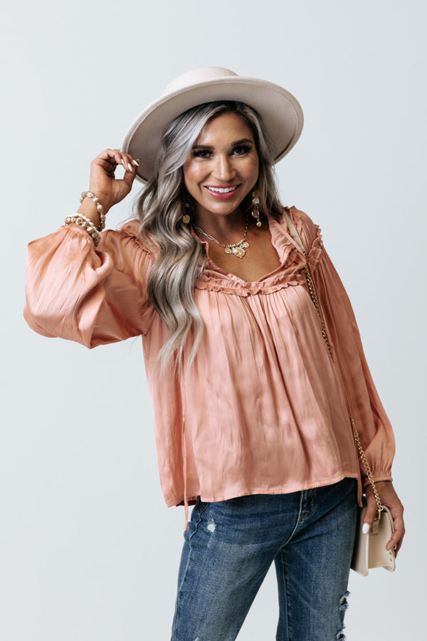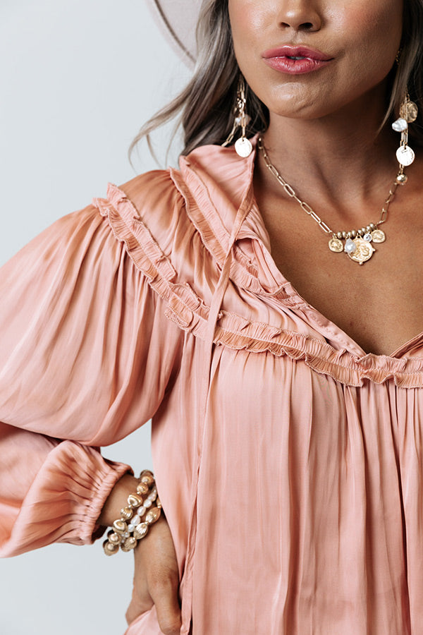 We have no doubt this darling peach colored top will become a staple in your wardrobe with its sleek lightweight and flowy material, cute ruffled and cinched detailing around the shoulders, a v-cut neckline with a tie-closure, long bubble sleeves, and a relaxed silhouette that falls into a straight hemline!