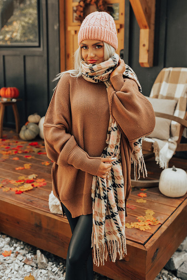 Cozy up with a hot cider in our 'Stars Hollow' houndstooth scarf! Features oversized scarf look, beige, blush, cream, and black colored houndstooth pattern, soft woven fabric, and fringe feature.