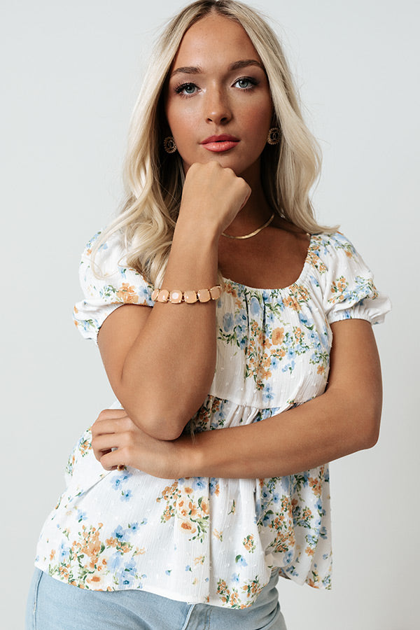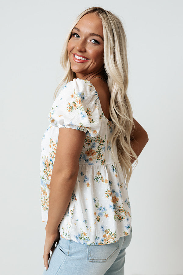 People are sure to be starstruck by you when you wear this pretty summer top featuring lightweight material with subtle polka dot texturing and a blue and orange floral print, a scooped neckline, short puff sleeves, and a flattering bodice that falls into a peplum bottom with an uneven hemline! Measurements