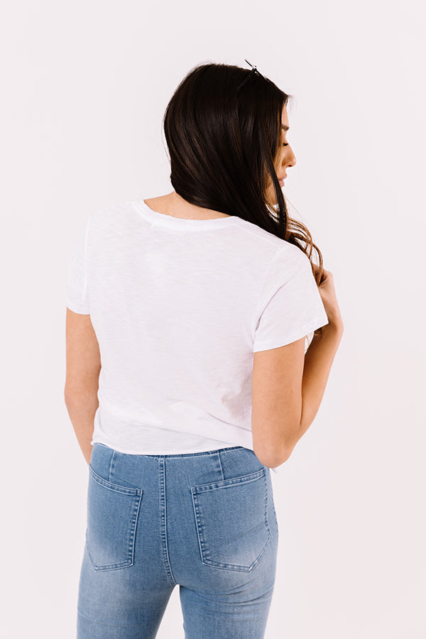 Start the day in style with this casual cute white featuring soft lightweight material, a v-cut neckline, short loose sleeves, and a relaxed silhouette that falls into a straight cropped hemline!