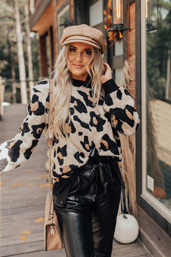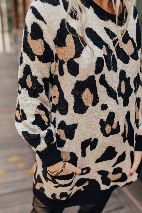 We have no doubt you will love this gorgeous light birch colored sweater featuring soft and warm knit material patterned with a large black and light brown leopard print, long loose sleeves, hidden low side pockets, black trim detailing, and a slouched silhouette that falls into a straight hemline!