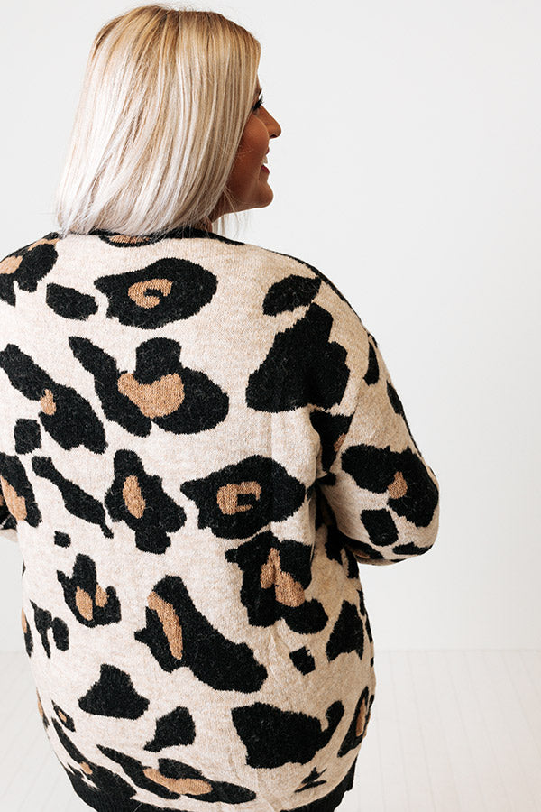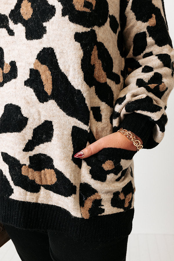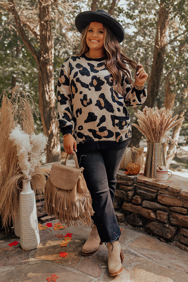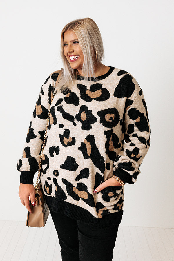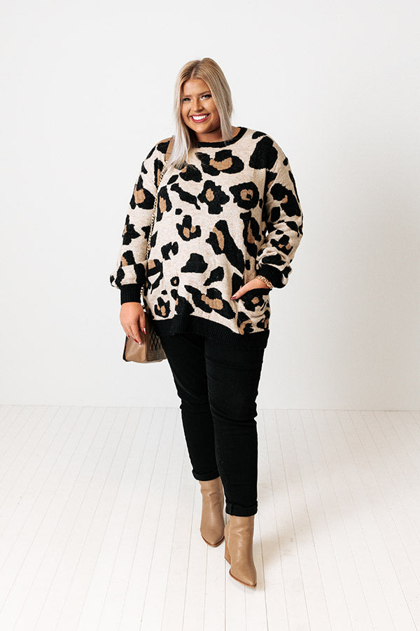 We have no doubt you will love this gorgeous plus size light birch colored sweater featuring soft and warm knit material patterned with a large black and light brown leopard print, long loose sleeves, hidden low side pockets, black trim detailing, and a slouched silhouette that falls into a straight hemline!