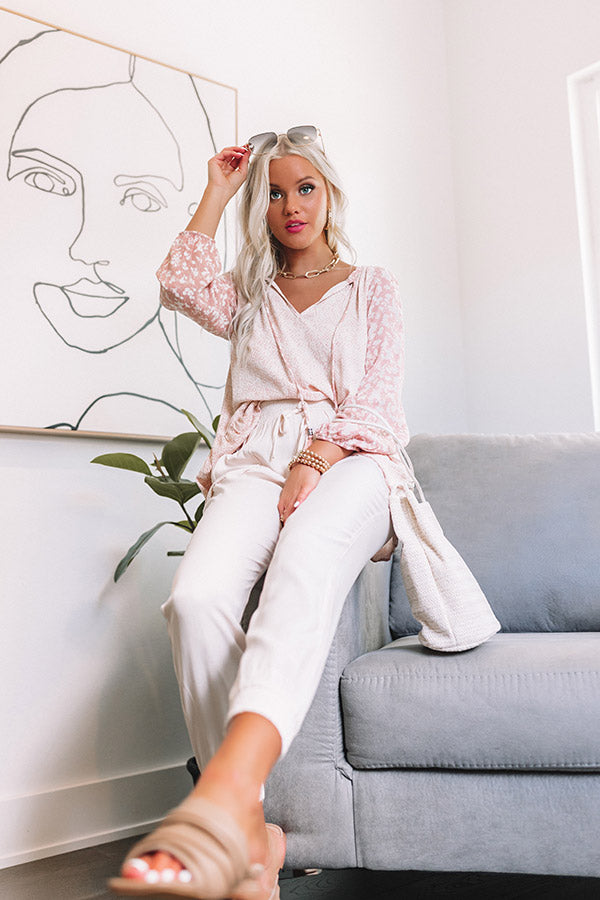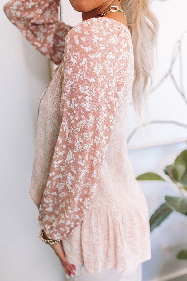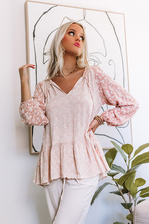 We have no doubt you will be in a state of bliss when you complete your look with this darling peach hued shift top featuring lightweight flowy material, a v-cut neckline with a tie closure, long loose sleeves patterned with a white floral print, and a relaxed silhouette that ends in a flirty peplum hemline!