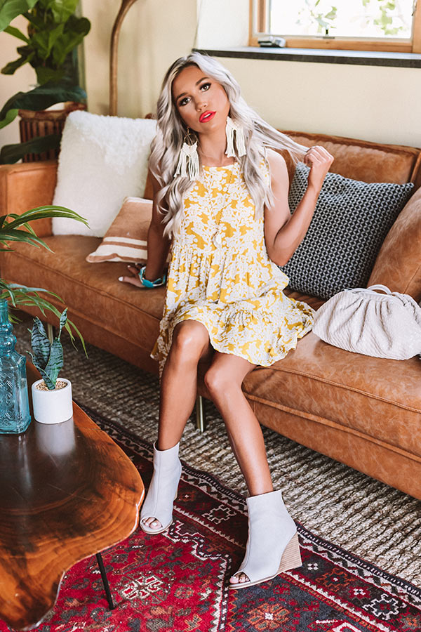 Flow from season to season in effortless style with this adorable mustard colored dress featuring lightweight breezy material patterned with a cute floral print, a high rounded neckline, wide 2-inch sleeveless shoulder straps, a zip closure back, and a relaxed silhouette that falls into a peplum bottom with an uneven mid-thigh length hemline! We have styled this darling piece with some white peep toe booties and statement earrings, but you can also wear it layered under a jean jacket with "The Rosella Wedge in Mustard," our "Plans In Paris Wool Hat in Cream," and our "City Chic Faux Leather Tote in Stone!" Measurements