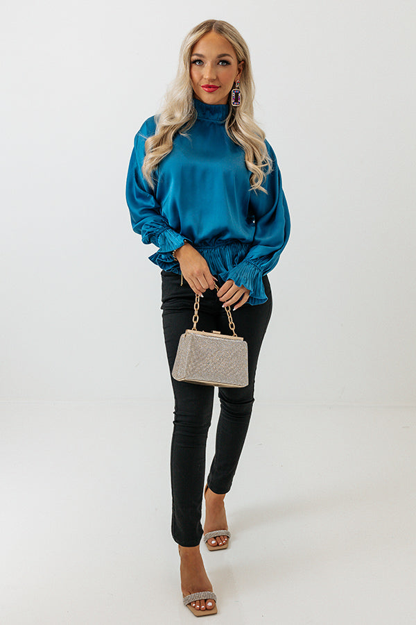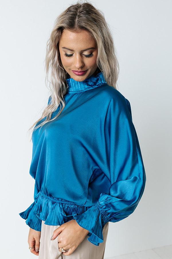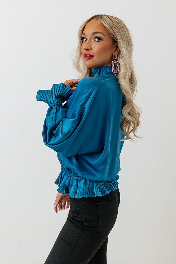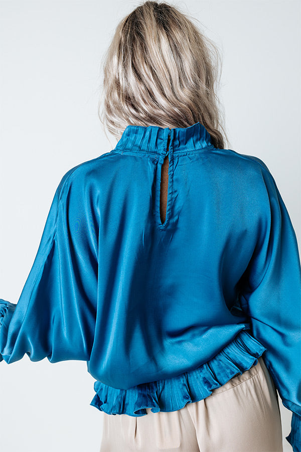 Whether you are headed to a holiday party or the office, our chic ocean blue 'Stating Facts Shift Top' is perfect for every . occasion with its lightweight satin-like material, high neckline, long bishop sleeves with flared cuffs, keyhole accented upper back with a button closure, and relaxed silhouette that falls into a cinched hemline with ruffled trim!