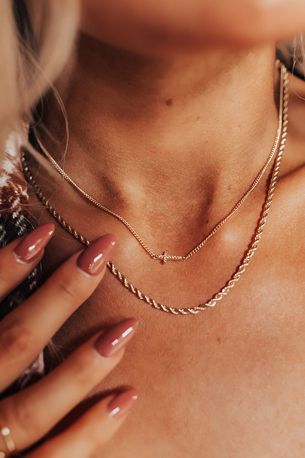 People are sure to chat with you and ask where you got this adorable gold necklace with its two layered pieces: a dainty chain with a small cross charm and a longer twisted chain!