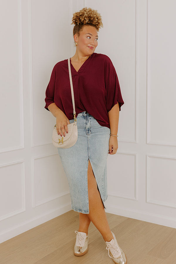 People are sure to stay and chat with you about where you got this darling maroon shift top featuring lightweight flowy material, a v-cut neckline, loose 3/4-length sleeves, and a relaxed silhouette that falls into a straight hemline with accent side slits!