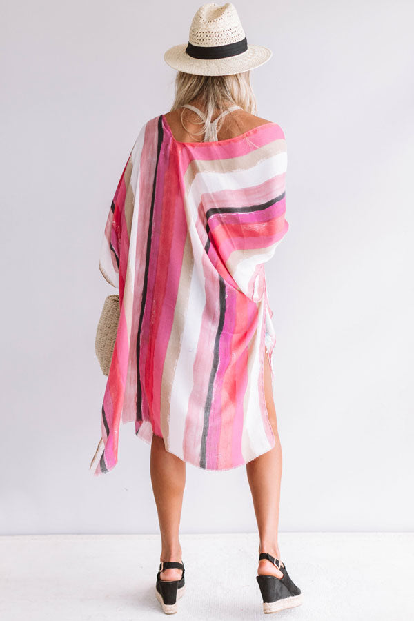 "Stay breezy" in this adorable overlay featuring ultra lightweight material patterned with pink hued vertical accent stripes, oversized half sleeves, and an ultra relaxed open front silhouette that falls into an uneven knee-length hemline with high side slits! You can layer this versatile piece with just about anything from a basic tank and denim shorts to your fave swimsuit! Measurements