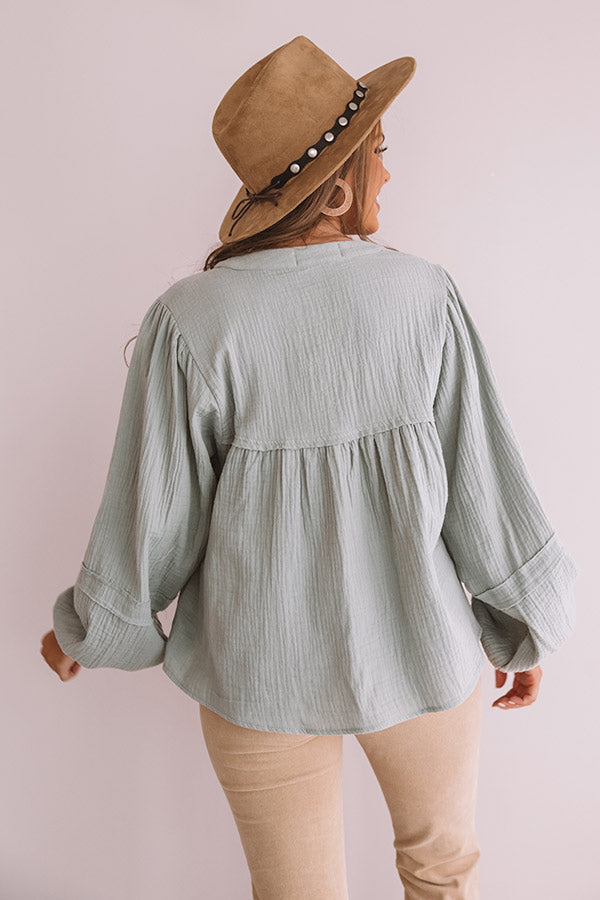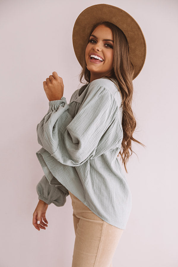Transition to the winter months in style with our seaglass colored "Stay Close Shift Top" featuring lightweight breeze material with subtle texturing, a deep v-cut neckline, long oversized bubble sleeves with fitted elastic banded cuffs, exposed raw cut accents seams, and an ultra relaxed silhouette that falls into an uneven hemlines! We have styled this adorable piece with some khaki flares, a neutral faux suede hat, and a snake print bootie and clutch, but you can also wear it with some distressed light wash ankle skinnies and "The Underwood Faux Leather Wedge in Natural!" Measurements