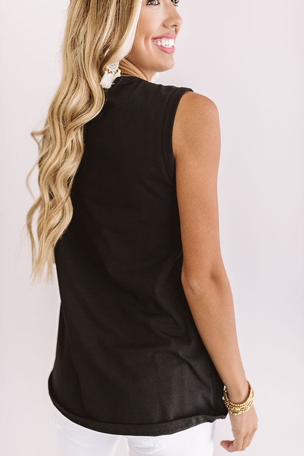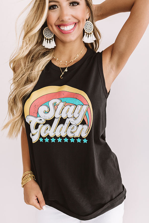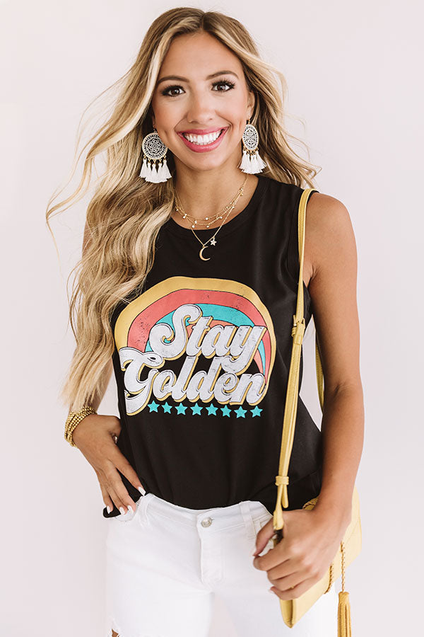 "Stay golden" in this graphic shift tank that has wide straps and features a stylish rainbow and cute lettering on the front! Pair this black piece with some white distressed jean, statement earrings, and black wedges or tucked into our "Vivienne Distressed Denim Skirt in Light Wash" and "The Delaney Sneaker in Gold" and a beige backpack for a trendy and unique summer festival outfit! Measurements