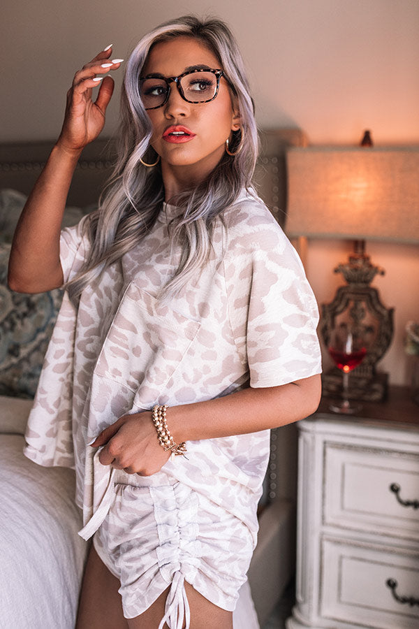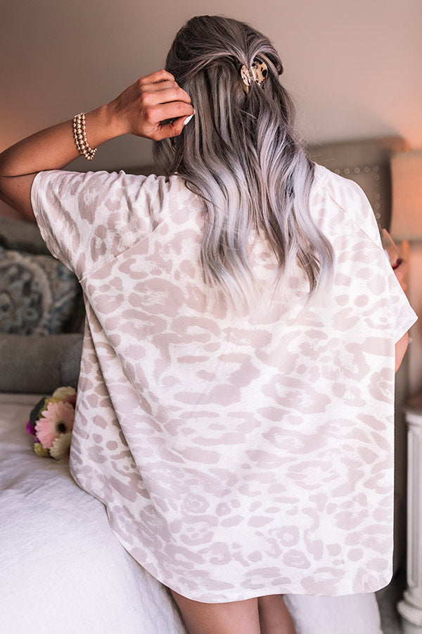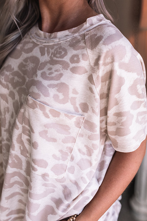 We have no doubt you will stay in love with this adorable shift top featuring soft lightweight material patterned with an iced latte colored leopard print, a single accent side pocket, a high neckline, short loose sleeves, and a slouched silhouette that ends in a straight hemline! Measurements