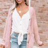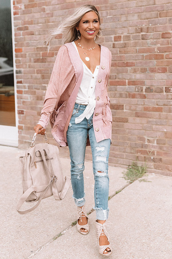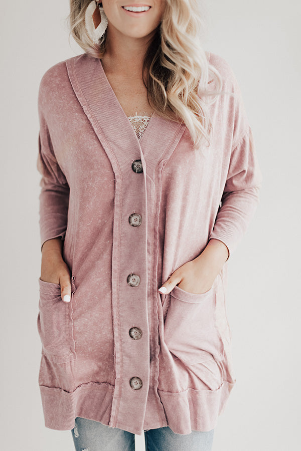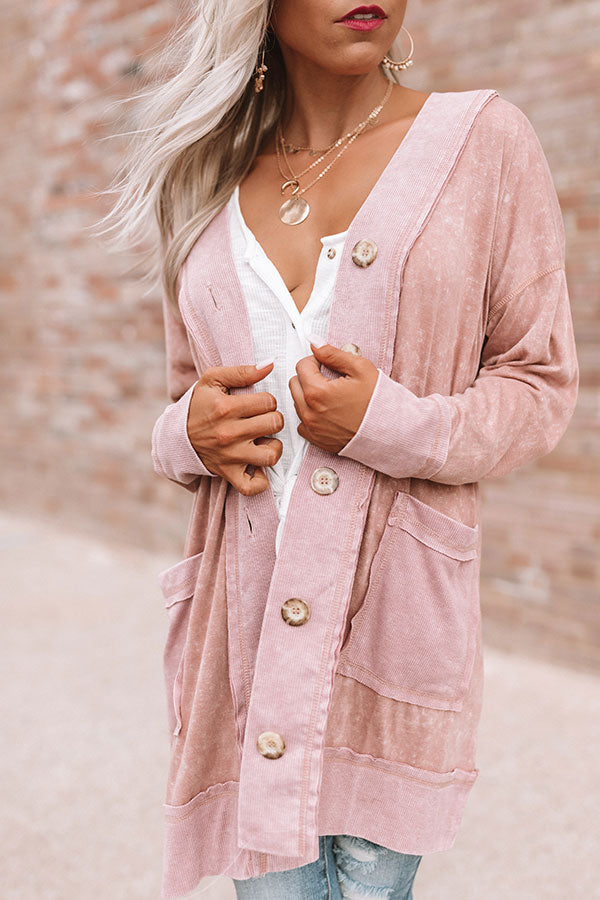 Stay warm and cozy on your fall "staycation" with this blush mineral wash cardigan adorned with a v-neck that falls into a button up front with oversized tortoiseshell buttons, long sleeves with thick ribbed cuffs, lightweight material, two large accent pockets, and a straight fit silhouette with an upper thigh length hemline! This charming piece can be styled over a casual white top with some distressed skinnies an a neutral cutout wedge and backpack, or it can be worn with a basic black tank underneath with our "Prosecco And Push Ups Midrise Legging" and "The Carter Sneaker in Pink!" Measurements