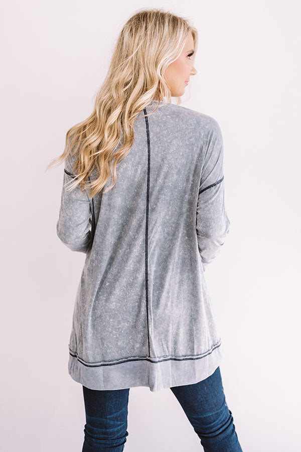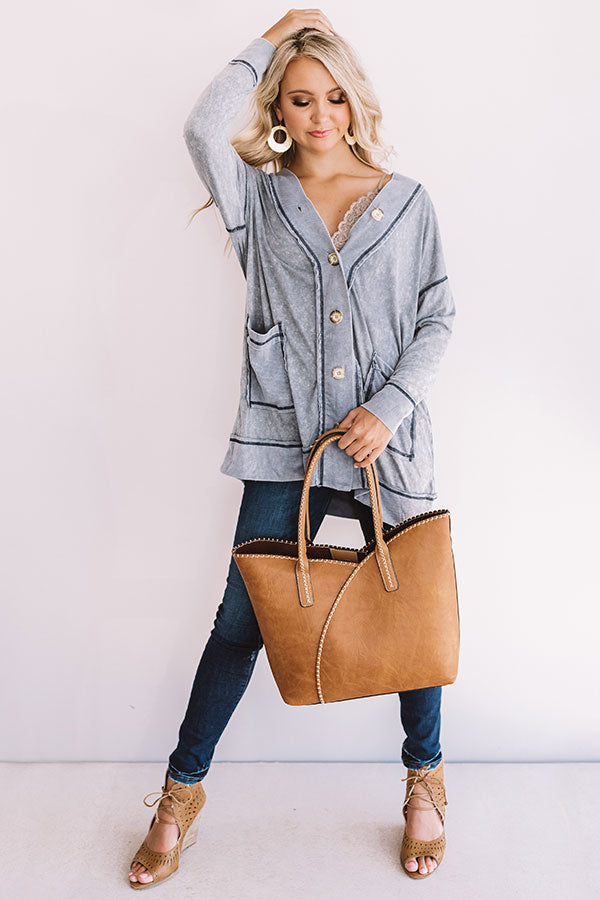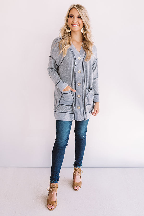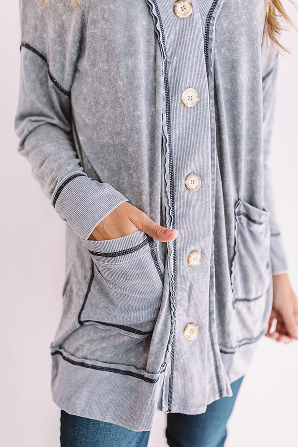 Stay warm and cozy on your fall "staycation" with this slate mineral wash cardigan adorned with a v-neck that falls into a button up front with oversized tortoiseshell buttons, long sleeves with thick ribbed cuffs, lightweight material, two large accent pockets, dark seams, and a straight fit silhouette with an upper thigh length hemline! This charming piece can be styled over a casual white top with some distressed shorts and a neutral heel, or it can be worn with a basic black tank underneath with our "Prosecco And Push Ups Midrise Legging" and "The Carter Sneaker in Light Grey!" Measurements