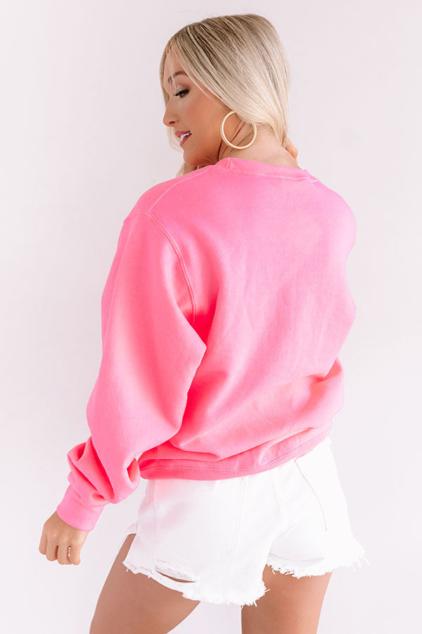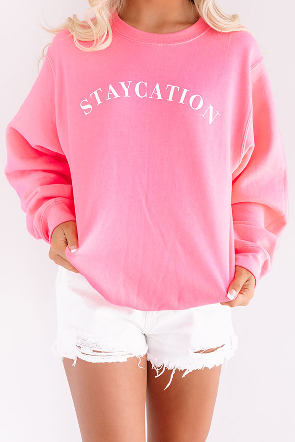 Stay chic on your "staycation" with this darling pink sweatshirt featuring soft lightweight material with white block lettering on the front, a high rounded neckline, long loose sleeves with fitted cuffs, and a relaxed silhouette that falls into a straight hemline! We have styled this comfy piece with some frayed white shorts and gold glitter sneakers, but you can also wear it with some distressed ankle skinnies, "The Lela Espadrille in White," black sunnies, and our "Three Day Weekend Canvas Tote!" Measurements