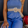 Complete your look effortlessly with our 'Staying In Capri' belt featuring a wide white and tan woven strap with an oversized rectangular resin buckle!