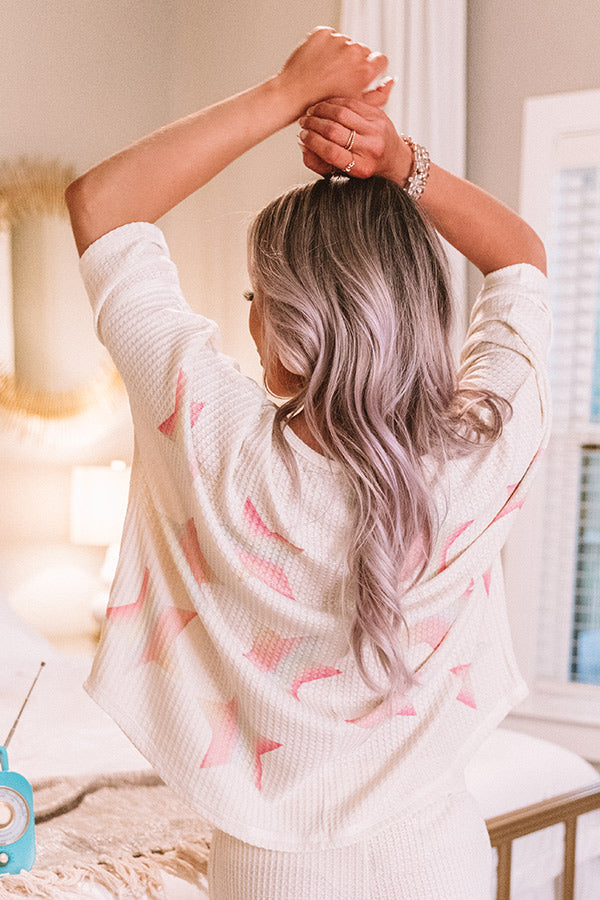 We guarantee you won't find a more comfy piece to wear while "staying in" than this adorable top featuring soft lightweight material patterned with large rainbow stars and subtle waffle knit texturing, a high rounded neckline, loose half sleeves, and a relaxed silhouette that falls into a rounded hemline! This cutie styles perfectly with our matching "Staying in Waffle Knit Shorts," some fuzzy slippers, and a matching scrunchie for the perfect two piece lounge look! Measurements