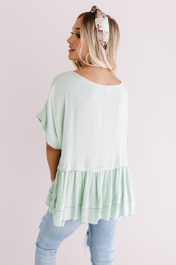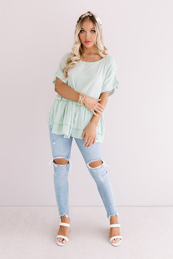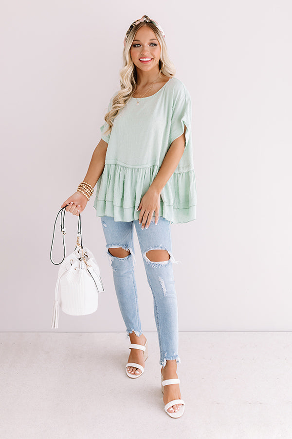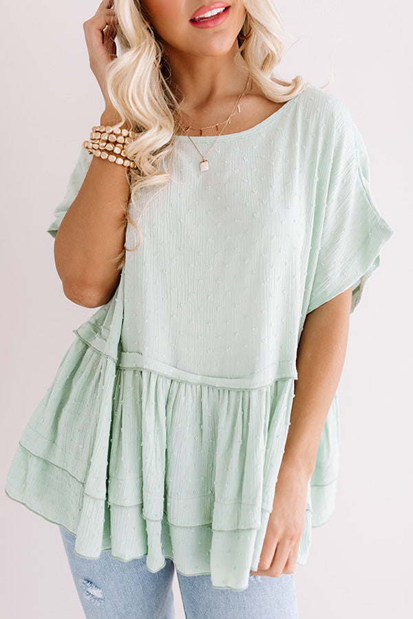 You are sure to LOVE this darling mint colored shift top featuring lightweight material patterned with subtle polka dot texturing, a high rounded neckline, short loose sleeves, and a relaxed silhouette that falls into a peplum bottom with an layered uneven hemline! We have styled this charming piece with some distressed ankle skinnies, a statement hair scarf, and a white mule heel and bucket bag, but you can also wear it with some frayed white shorts and "The Melina Heel in Mint!" Measurements