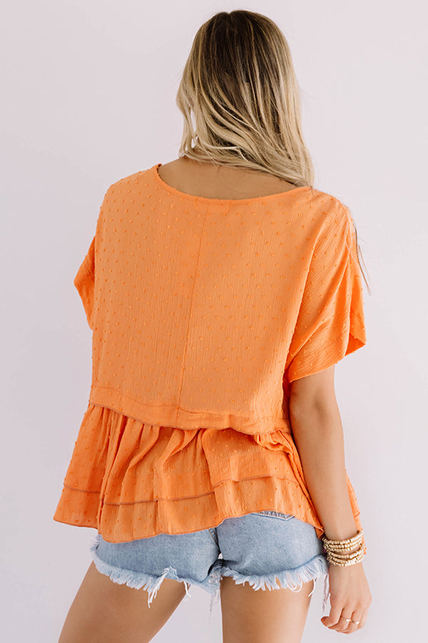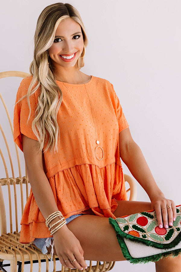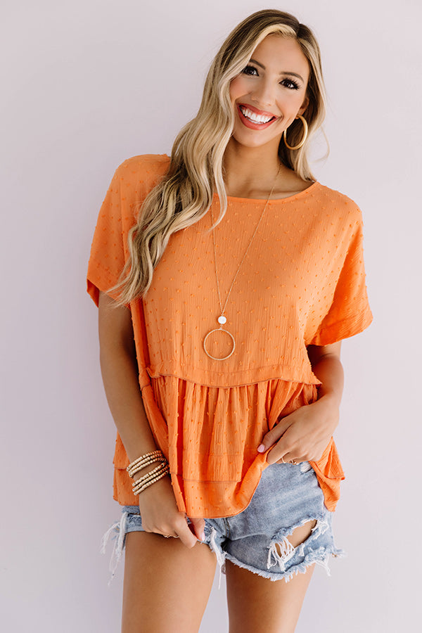 You are sure to LOVE this darling persimmon colored shift top featuring lightweight material patterned with subtle polka dot texturing, a high rounded neckline, short loose sleeves, and a relaxed silhouette that falls into a peplum bottom with an layered uneven hemline! We have styled this charming piece with some distressed denim shorts, brown block heels, and a woven clutch, but you can also wear it with some frayed white skinnies, "The Mara Sandal in Persimmon" and our "Sippin' At Sunset Sunnies in White!"