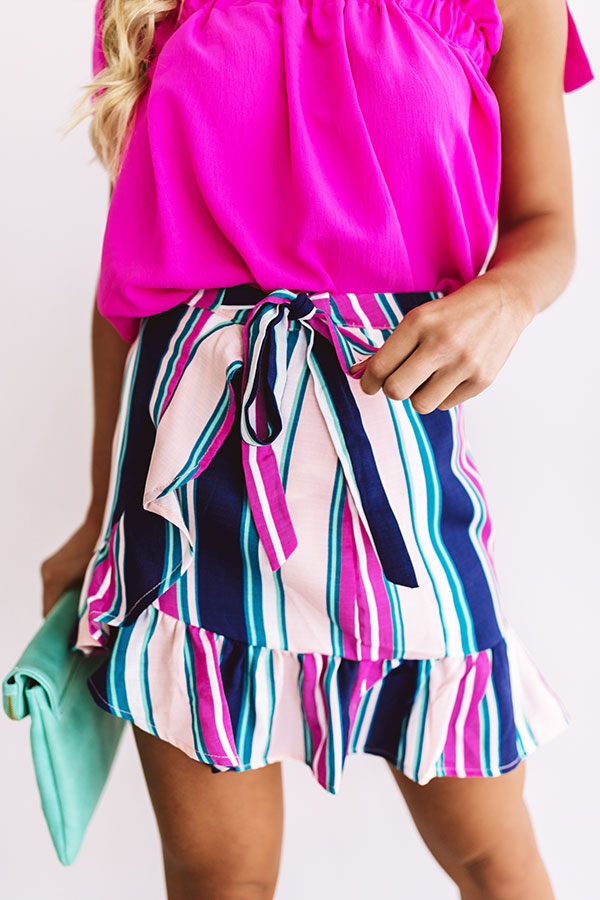 You will steal the spotlight in this vibrant skirt with its blue and pink stripes, ruffled hemline, tie belt, and zipper! Pair with a matching top and nude platform heels for a bold style that can be worn to brunch or out to evening dinner! Measurements