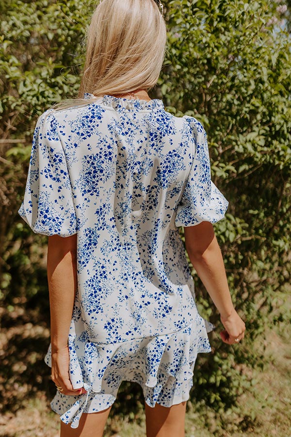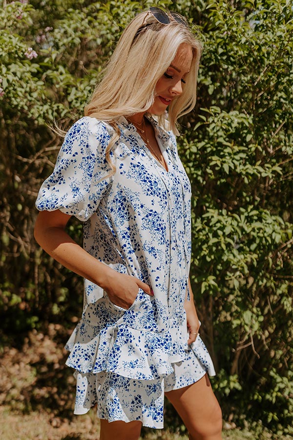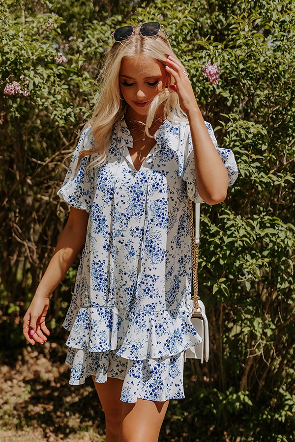 We have no doubt you will be stealing hearts when you arrive in this charming white shift dress featuring lightweight material patterned with a royal blue floral print, a tie closure v-cut neckline with subtle ruffle trim detailing, short puff sleeves, hidden side pockets, and a relaxed silhouette that falls into a tiered mid-thigh length ruffled hemline! on products