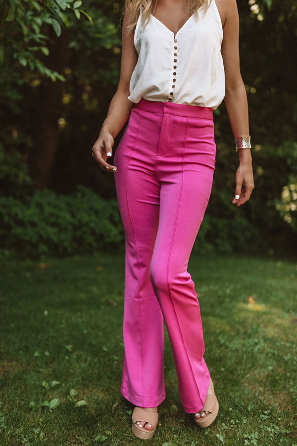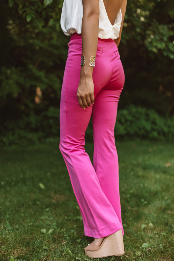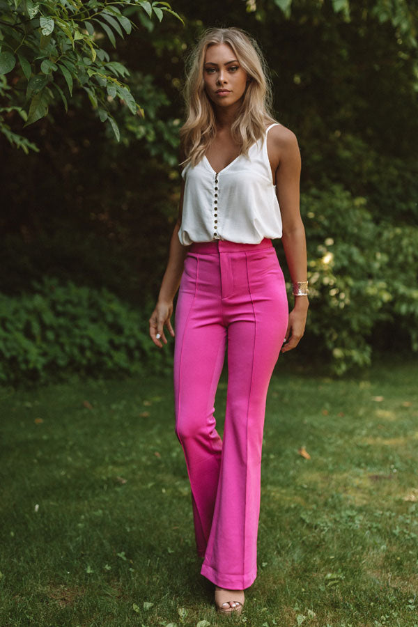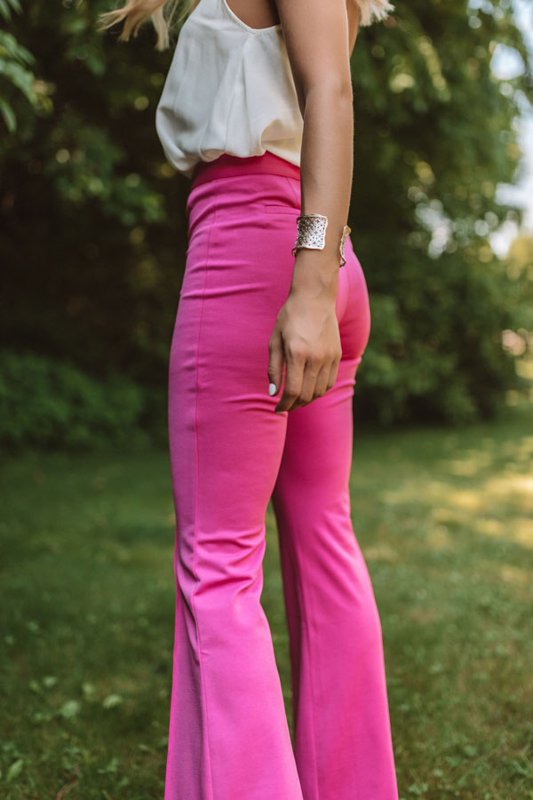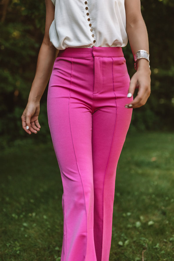 These pink trousers are for all you girl bosses out there who are chasing your dreams! They have a stretchy fit, flared bottoms, a pressed seam down each leg, a hidden zipper with a clasp closure, and two pocket cuts in the back! Pair with a simple tank, neutral heels, and a statement blazer for the ultimate working girl outfit! Measurements