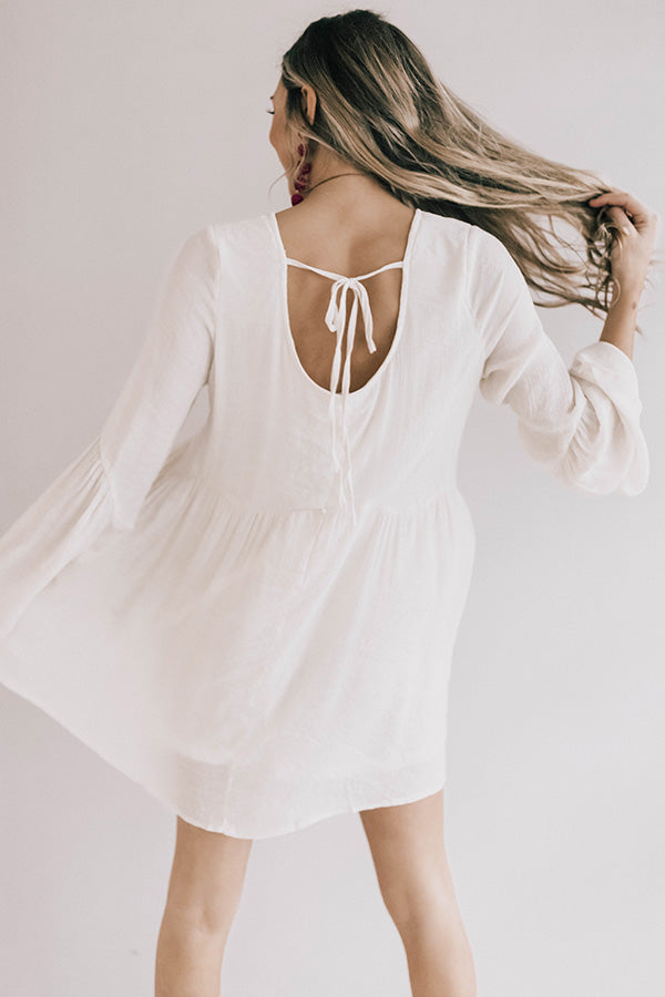 This floral embroidered babydoll dress has long bell sleeves, a breezy babydoll silhouette that is decorated with gorgeous floral embroidery & a scooped upper back that ties at the back of the neckline.