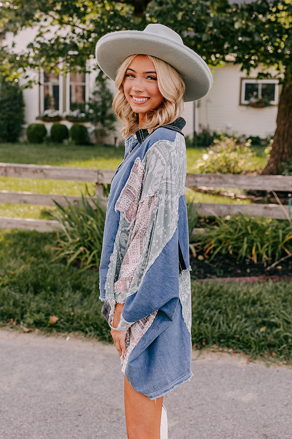 - Unlined chambray material with patches of waffle knit material as well as green and pink hued patches