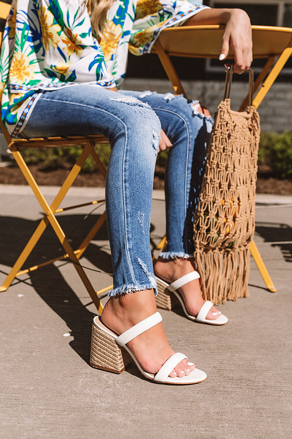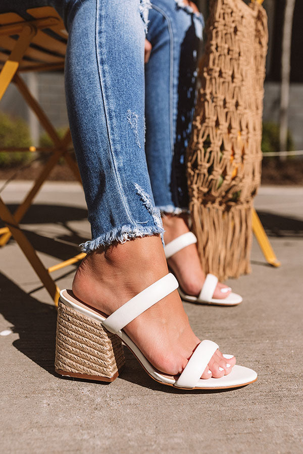 The chic white "Steve Madden Marcella" heel features 3.5-inch jute block heels with woven ribbed texturing, rounded open toes, and two leather over-the-foot straps!