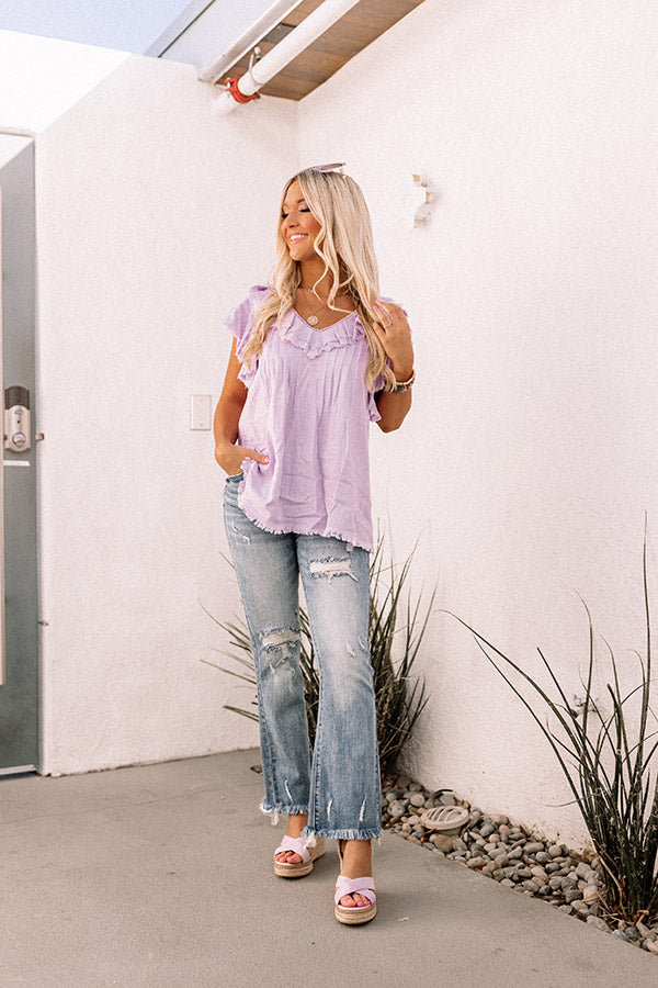Slay all day in our adorable lavender hued 'Stick Around Shift Top' featuring lightweight material, a v-cut neckline with ruffle trim detailing, ruffled cap sleeves, and a relaxed silhouette that falls into a straight hemline!
