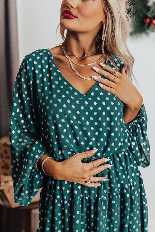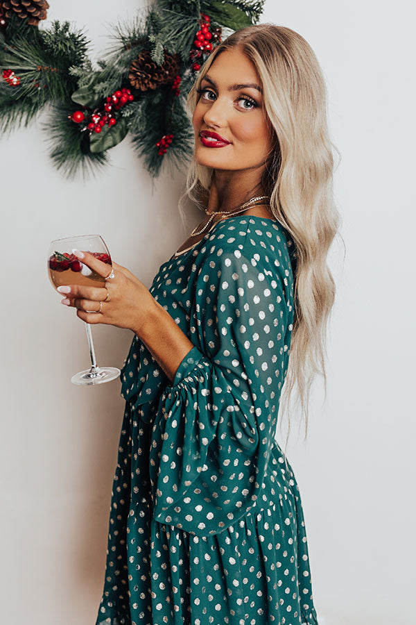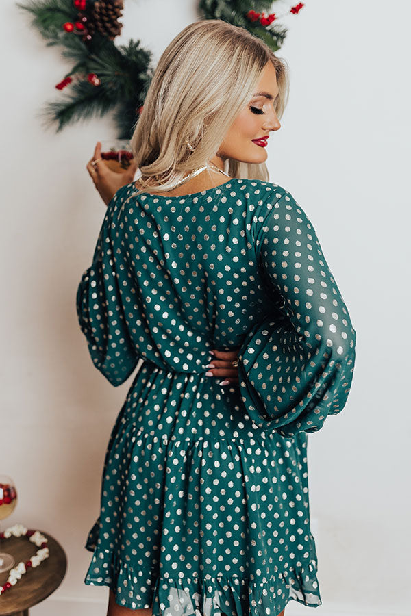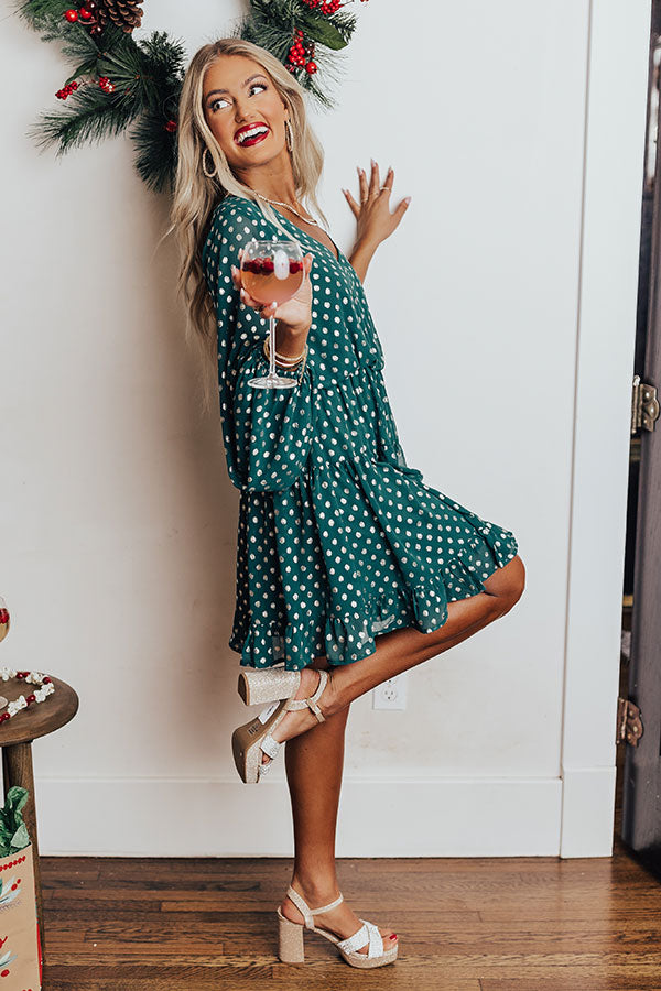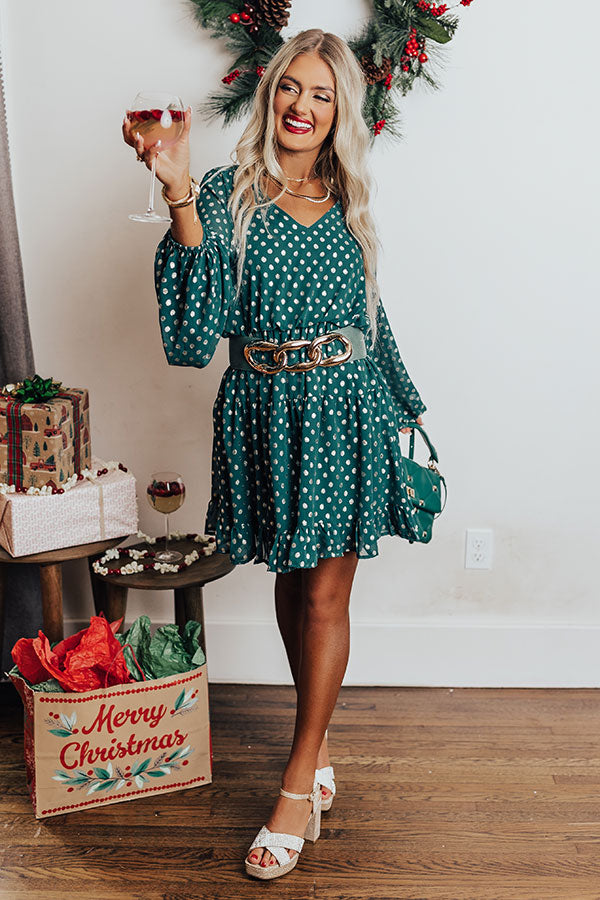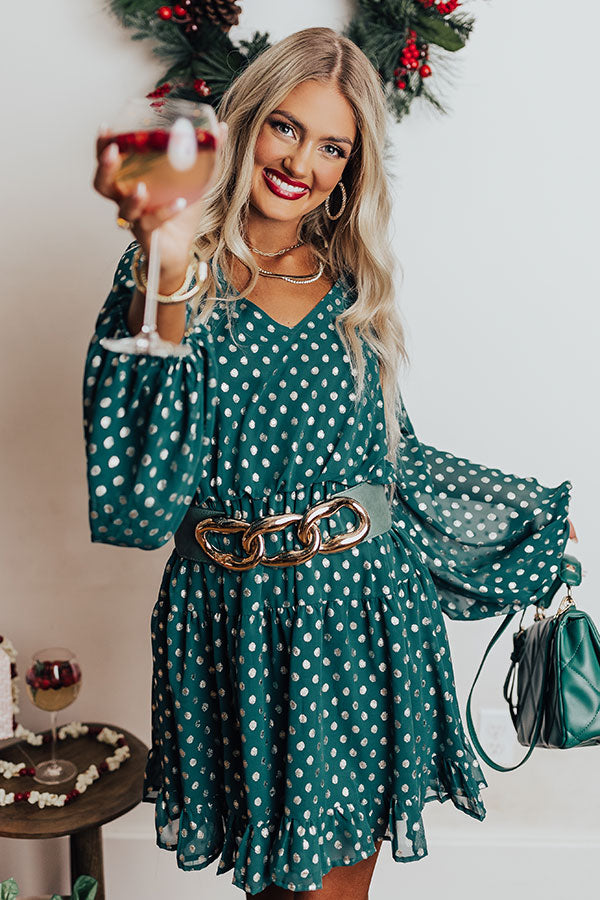 Believe us when we say you'll want to be spotted in this adorable hunter green 'Stolen Kisses' dress featuring lightweight flowy material patterned with gold polka dots, a v-cut neckline, long oversized sleeves, a cinched waistline, and a relaxed silhouette that falls into a ruffled mid-thigh length hemline!
