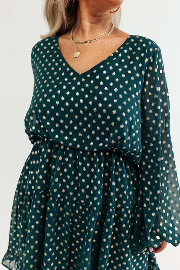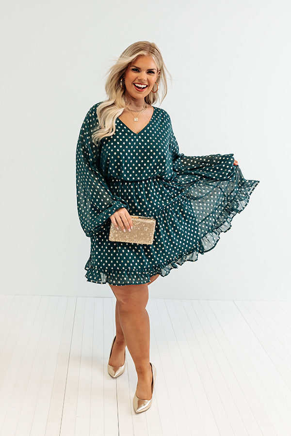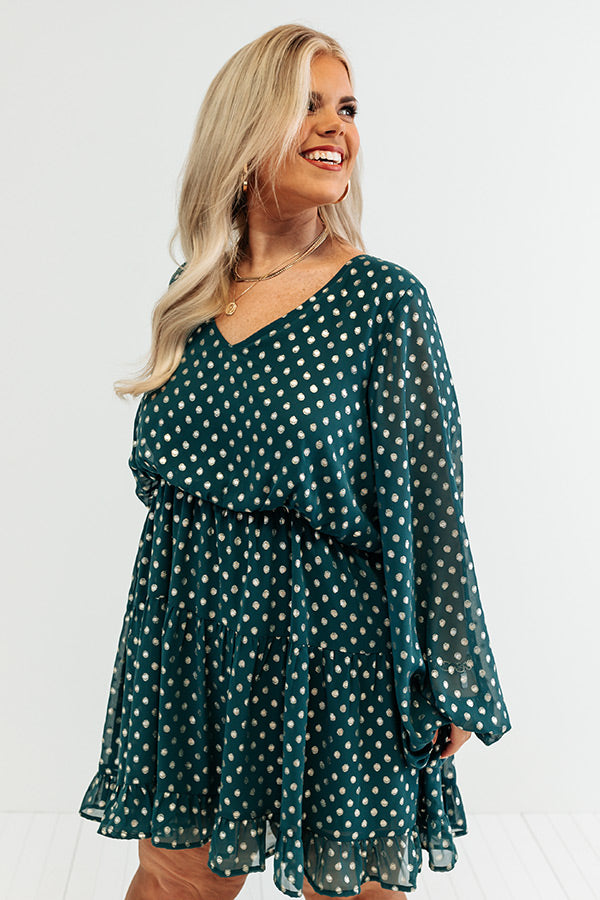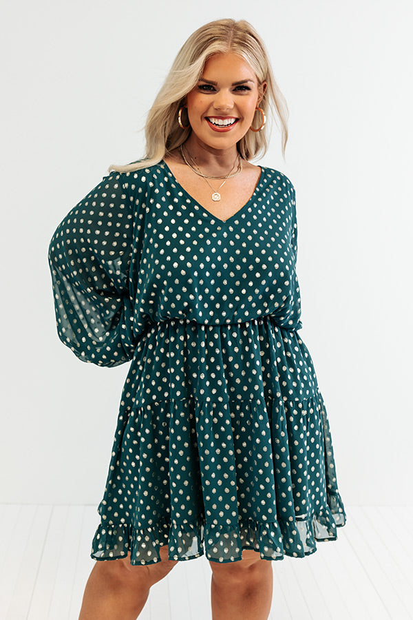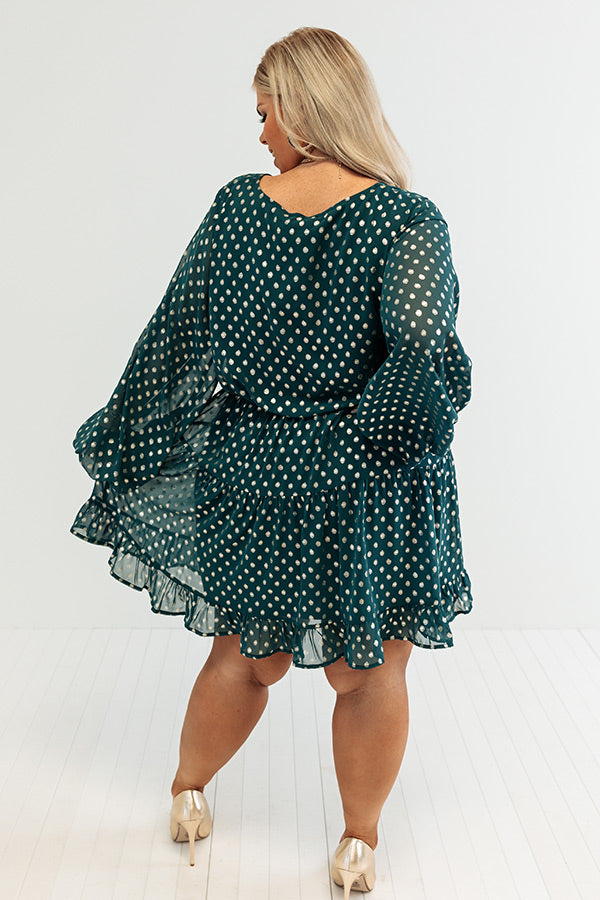Believe us when we say you'll want to be spotted in this adorable hunter green plus size 'Stolen Kisses' dress featuring lightweight flowy material patterned with gold polka dots, a v-cut neckline, long oversized sleeves, a cinched waistline, and a relaxed silhouette that falls into a ruffled mid-thigh length hemline!