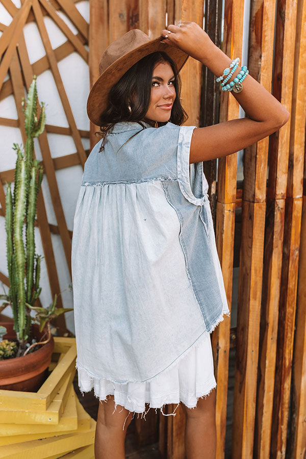 The ideal boho layering piece, our cute 'Story For Another Time' top features patchwork chambray material with exposed seam detailing and accent fading, a button down front with a collared neckline, cuffed cap sleeves, and a slouched silhouette that ends in a rounded hemline!