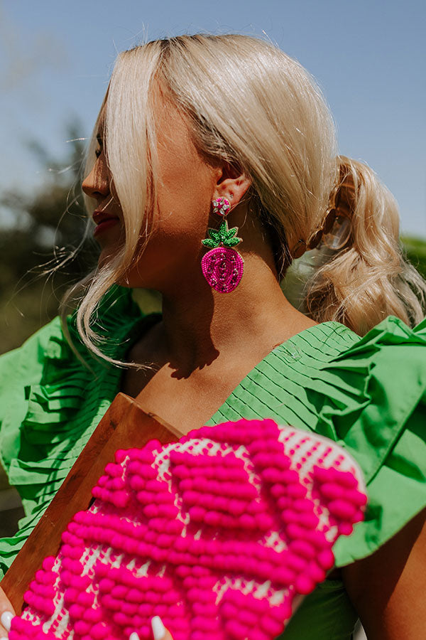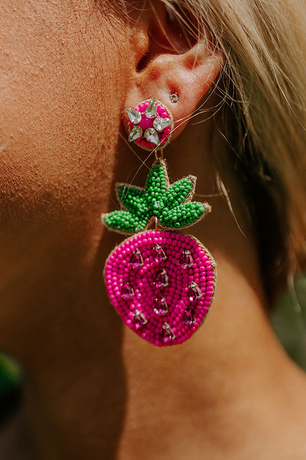Make a fun summer statement with our adorable 'Strawberry Kisses' earrings featuring dangling beaded green and hot pink strawberries!