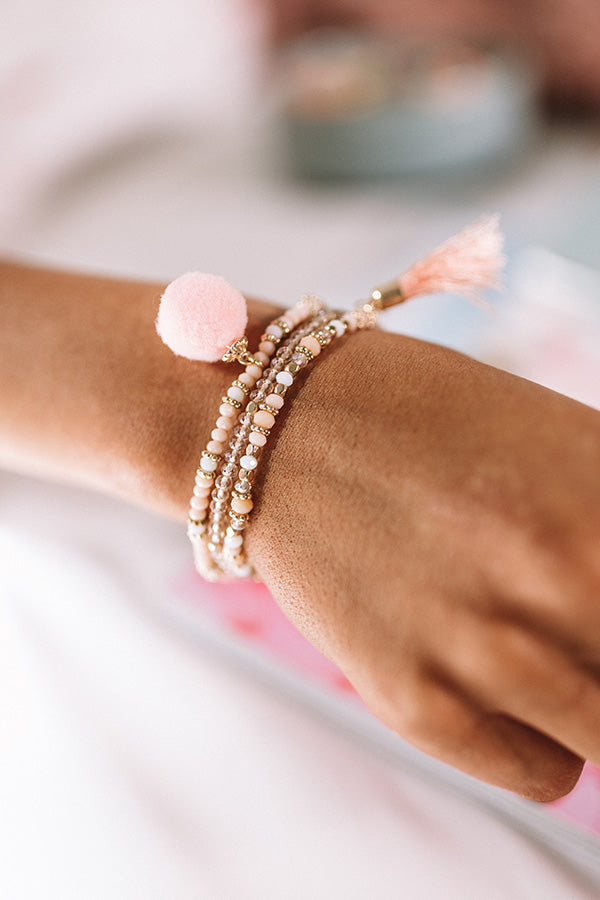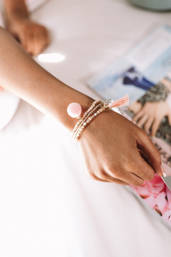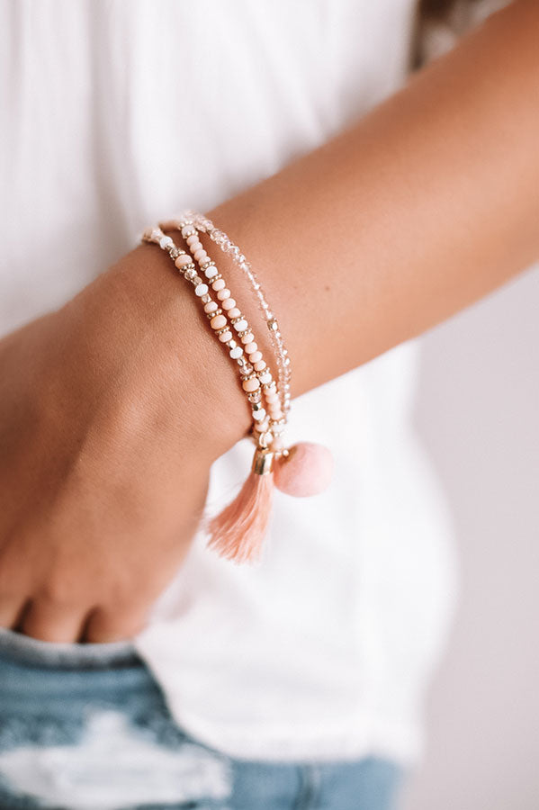You are sure to look "street chic" when you accessorize with this adorable bracelet set featuring three pieces with peach colored beads, pom pom charm, and accent tassel!