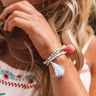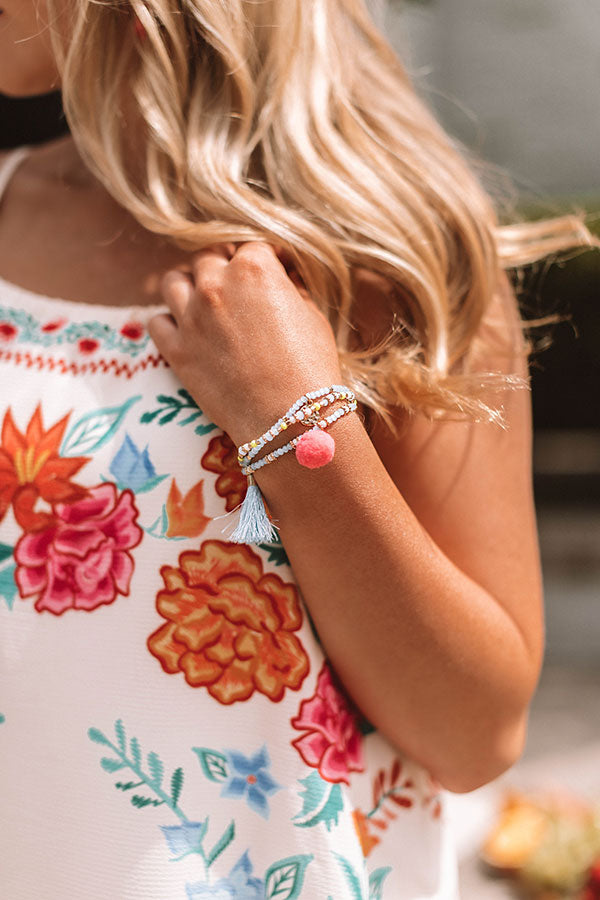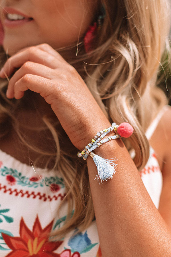 You are sure to look "street chic" when you accessorize with this adorable bracelet set featuring three pieces with serenity colored beads, a red pom pom charm, and accent tassel!