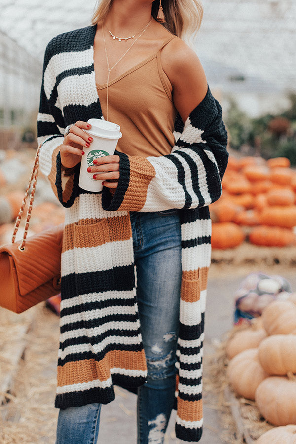 Cozy up for fall in our 'Stripes And Lattes' cardigan featuring lightweight tight knit material with ribbed texturing, horizontal black, white, and rust colored accents stripes, long loose sleeves, with flared cuffs, hidden side pockets, and a relaxed open front silhouette that falls into a straight knee-length hemline!