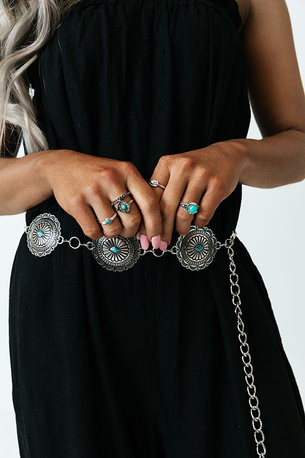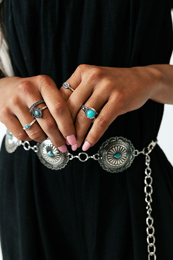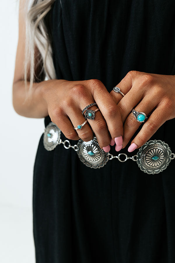 You will look like you just stepped off the runway when you accessorize with our luxe silver 'Stroll The Streets Ring Set' featuring five pieces with a variety of gold bands and turquoise accent details! Size 7.