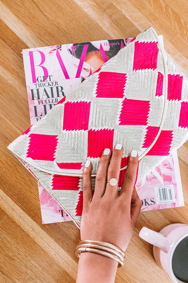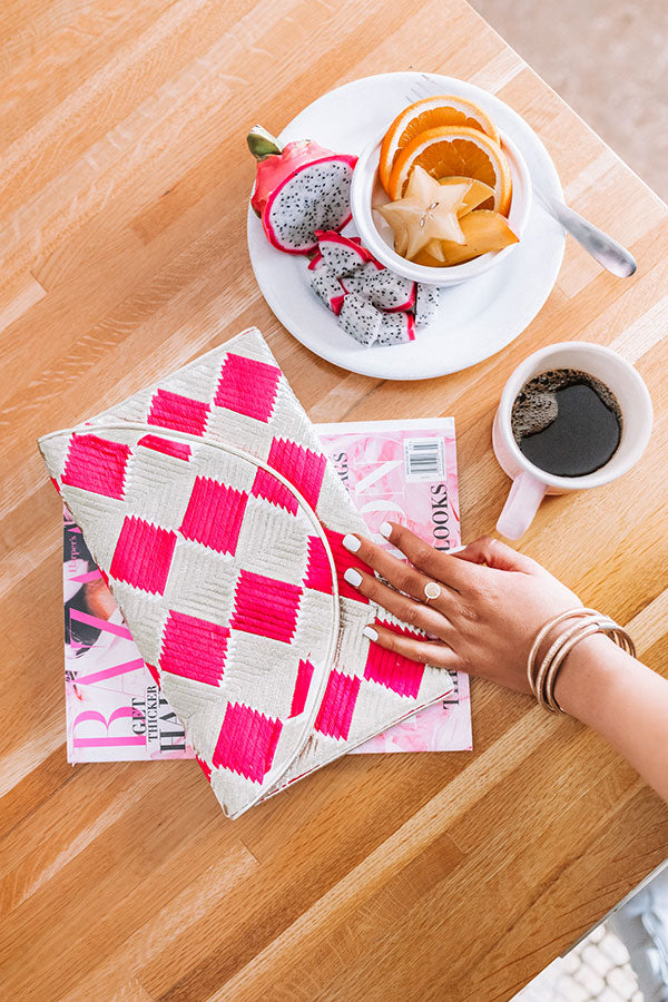 There is no better piece to accessorize with while "strolling in Cabo" than this adorable clutch featuring woven material with hot pink and neutral checkered pattern, a flap closure with a snap button, and a rectangular pouch!